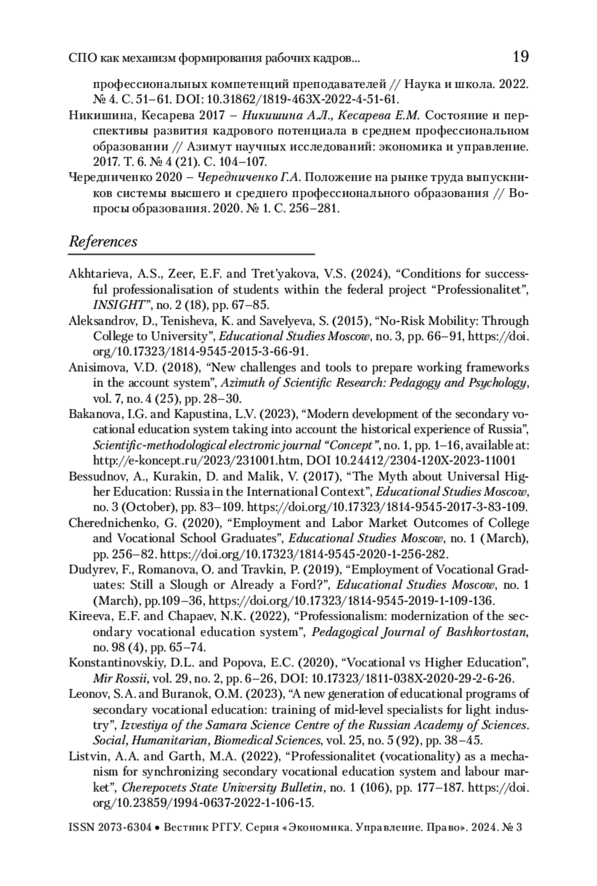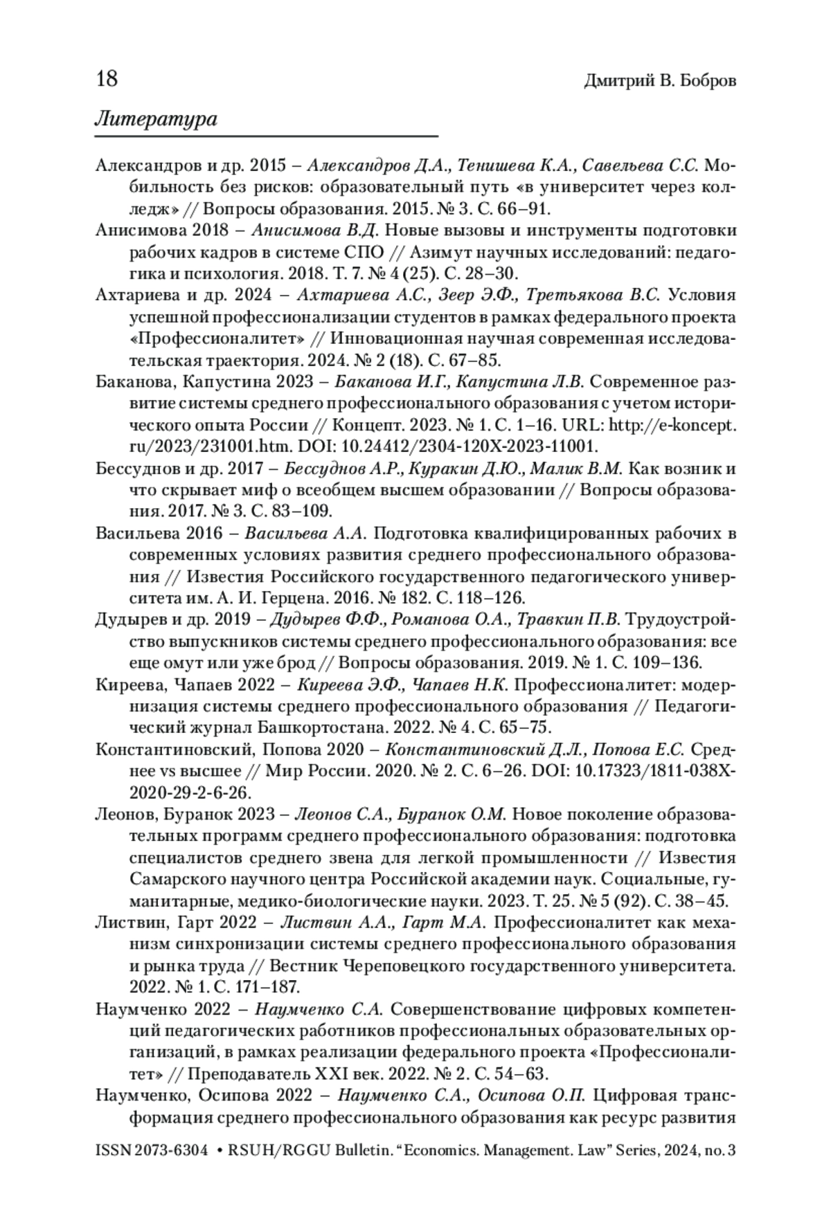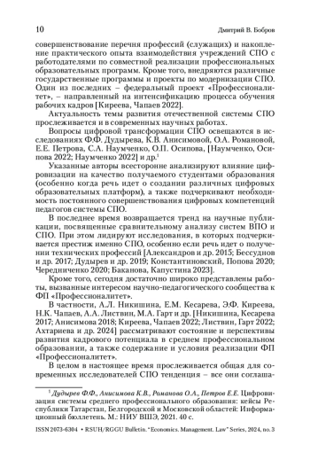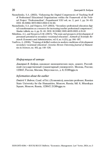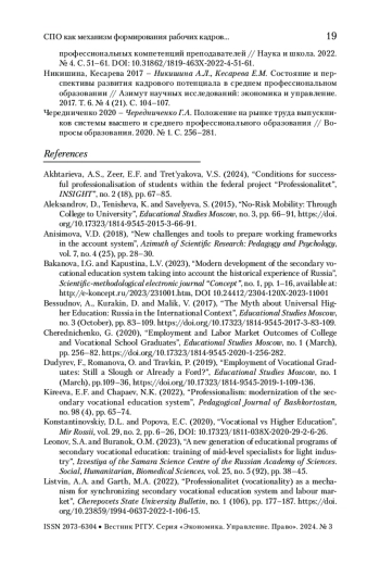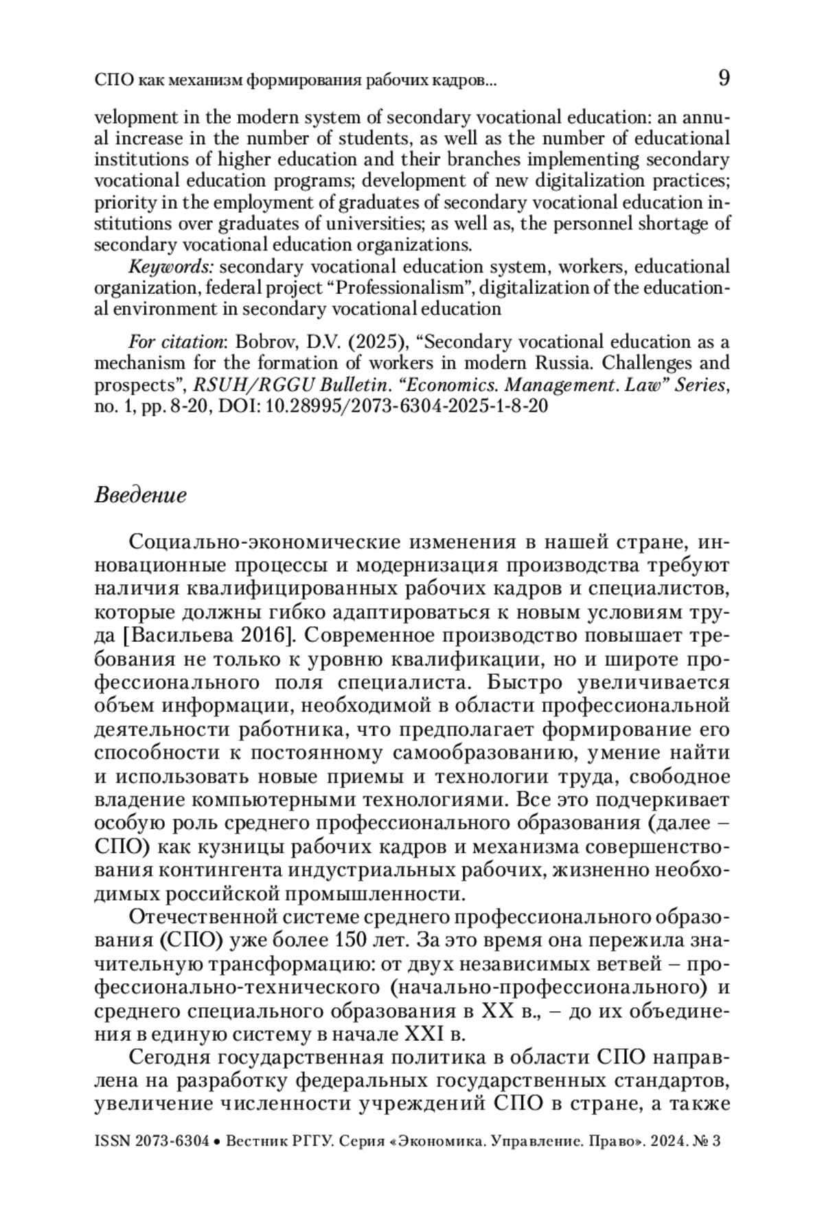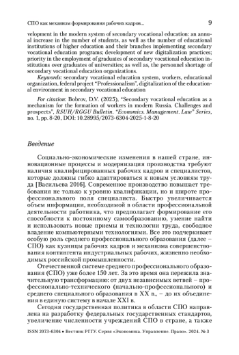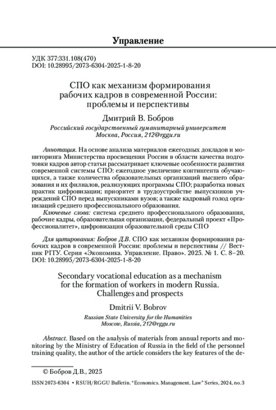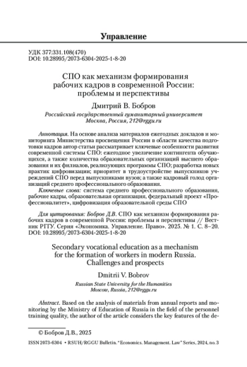 БОБРОВ Д. В. СПО КАК МЕХАНИЗМ ФОРМИРОВАНИЯ РАБОЧИХ КАДРОВ В СОВРЕМЕННОЙ РОССИИ: ПРОБЛЕМЫ И ПЕРСПЕКТИВЫ // ВЕСТНИК РГГУ. СЕРИЯ: ЭКОНОМИКА. УПРАВЛЕНИЕ. ПРАВО. 2025. № 1