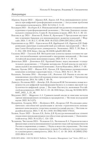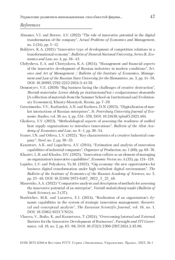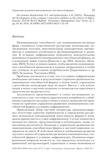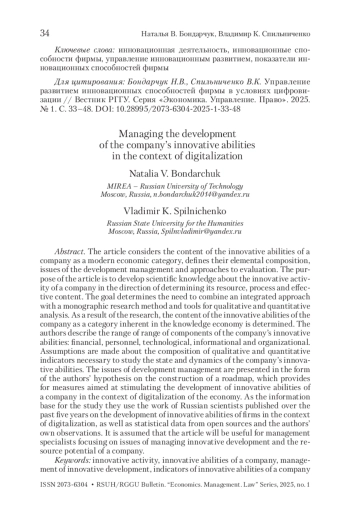 БОНДАРЧУК Н. В., СПИЛЬНИЧЕНКО В. К. УПРАВЛЕНИЕ РАЗВИТИЕМ ИННОВАЦИОННЫХ СПОСОБНОСТЕЙ ФИРМЫ В УСЛОВИЯХ ЦИФРОВИЗАЦИИ // ВЕСТНИК РГГУ. СЕРИЯ: ЭКОНОМИКА. УПРАВЛЕНИЕ. ПРАВО. 2025. № 1