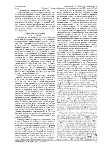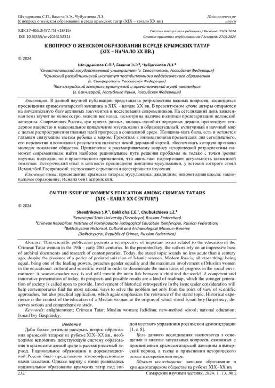 В данной научной публикации представлена ретроспектива важных вопросов, касающихся просвещения крымскотатарской женщины в XIX - начале XX вв. В презентуемом ключе авторы опираются на внушительную базу архивных документов и исследования современников. На сегодняшний день заявленная тема звучит не менее остро, нежели век назад, несмотря на наличие политики пролетаризации исламской женщины. Современная Россия, при прочих равных, являясь одной из передовых держав, проповедует гендерное равенство и максимальное привлечение мусульманки в образовательный, культурный и научный мир с целью распространения главных идей прогресса в социальной среде. Женщина-мать была, есть и останется главным связующим звеном ребенка с миром. Грамотная и инновационная презентация дня сегодняшнего, его перспектив и возможных результатов являются некой дорожной картой, обеспечивать которую призвано молодое поколение общества. Привлечение к рассматриваемому вопросу исторической ретроспективы поможет современникам найти наиболее рациональные пути решения проблемы не только с точки зрения научных подходов, но и практического применения, что опять-таки подчеркивает актуальность заявленной тематики. Исторический опыт в контексте просвещения женщины-мусульманки, у истоков которого стоял Исмаил бей Гаспринский, заслуживает серьезного и всестороннего изучения.