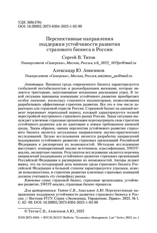 Внешняя среда современного бизнеса характеризуется глобальной нестабильностью и разнообразными вызовами, которые являются триггерами, запускающими механизмы реализации угроз. В такой ситуации принципы концепции устойчивого развития приобретают особое значение, поскольку становятся индикаторами, позволяющими разрабатывать эффективные стратегии развития. Все это в том числе характерно для страховой отрасли России. Страховой бизнес на данный момент переживает переходный период, который характеризуется полной перестройкой внутреннего страхового рынка России. Такая ситуация вынуждает ключевые страховые организации пересматривать свои стратегии устойчивого развития для их адаптации к новым требованиям внешней среды. Таким образом, оценка перспектив устойчивого развития страхового бизнеса является актуальным направлением научно-практических исследований. Целью исследования является разработка направлений поддержания устойчивого развития страховых организаций Российской Федерации и расширения их возможностей. Методами исследования выступают: компаративный анализ источников, классификация, SWOT-анализ, экспертные оценки. Результатом исследования является перечень направлений поддержания устойчивого развития страховых организаций Российской Федерации и расширения их возможностей. Авторы делают вывод, что на сегодняшний день внешняя среда страхового бизнеса Российской Федерации в большей степени характеризуется угрозами, нежели возможностями, и стратегии развития ключевых страховых компаний должны учитывать эту специфику рынка.