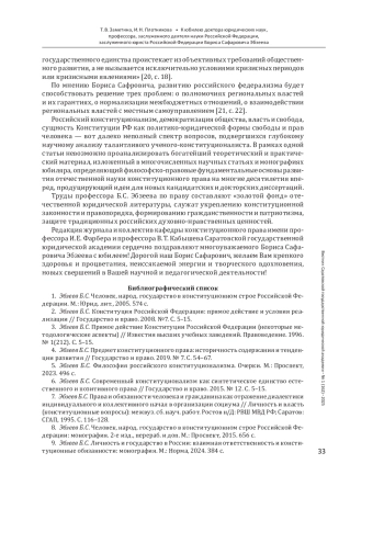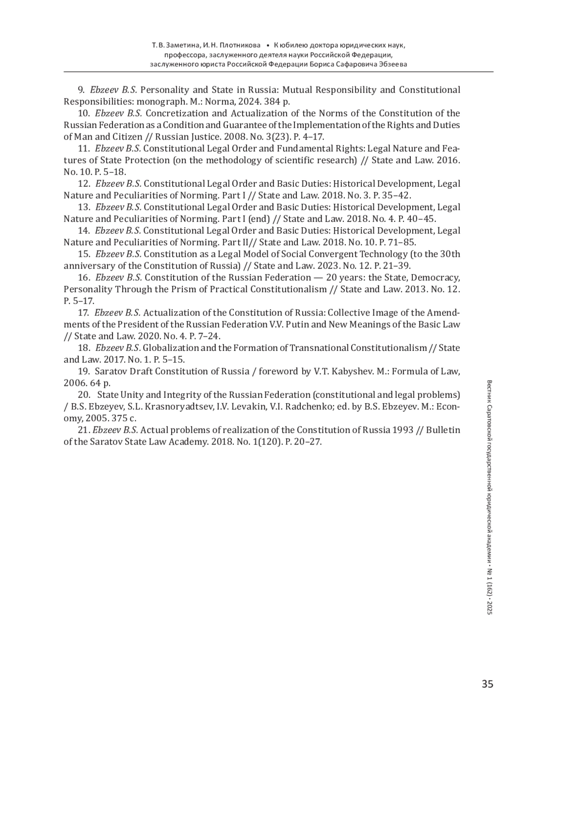 ЗАМЕТИНА Т. В., ПЛОТНИКОВА И. Н. К ЮБИЛЕЮ ДОКТОРА ЮРИДИЧЕСКИХ НАУК, ПРОФЕССОРА, ЗАСЛУЖЕННОГО ДЕЯТЕЛЯ НАУКИ РОССИЙСКОЙ ФЕДЕРАЦИИ, ЗАСЛУЖЕННОГО ЮРИСТА РОССИЙСКОЙ ФЕДЕРАЦИИ БОРИСА САФАРОВИЧА ЭБЗЕЕВА // ВЕСТНИК САРАТОВСКОЙ ГОСУДАРСТВЕННОЙ ЮРИДИЧЕСКОЙ АКАДЕМИИ. 2025. № 1 (162)