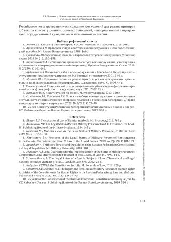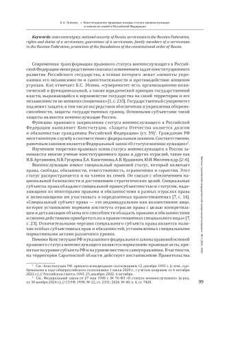 ГОЛОВКО К. А. КОНСТИТУЦИОННО-ПРАВОВЫЕ ОСНОВЫ СТАТУСА ВОЕННОСЛУЖАЩИХ И ЧЛЕНОВ ИХ СЕМЕЙ В РОССИЙСКОЙ ФЕДЕРАЦИИ // ВЕСТНИК САРАТОВСКОЙ ГОСУДАРСТВЕННОЙ ЮРИДИЧЕСКОЙ АКАДЕМИИ. 2025. № 1 (162)