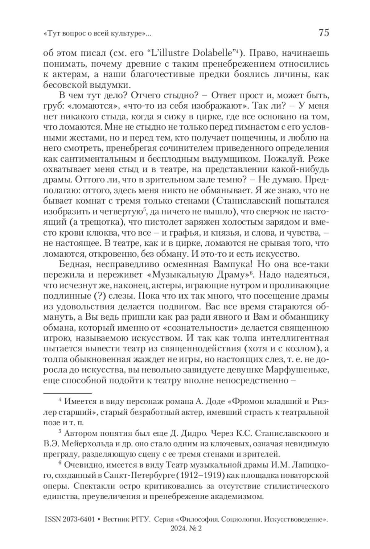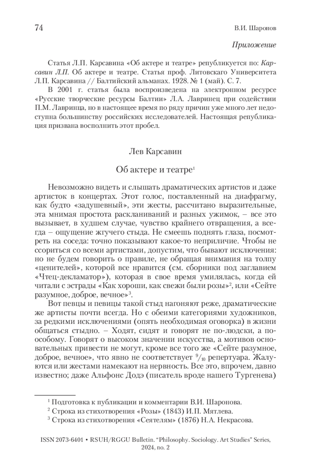 Статья посвящена малоизвестному тексту Л. П. Карсавина, опубликованному в журнале «Балтийский альманах» в мае 1928 г. Несмотря на кажущуюся краткость, текст Л. П. Карсавина «Об актере и театре» вобрал в себя многие биографические обстоятельства биографии автора, общественные дискуссии, которые определили взгляды и оценки Карсавина на зрелищное искусство, литературу и радикальные изменения в современной культуре. Изучение этих во многом деталей и связей, прямых и скрытых намеков, содержащихся в статье, позволяет нам лучше понять философские взгляды автора и особенности его личности.
