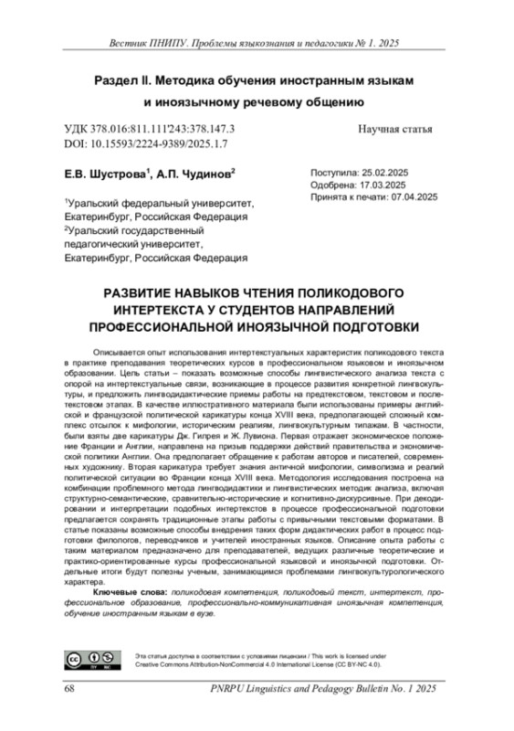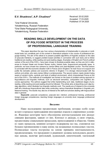 Описывается опыт использования интертекстуальных характеристик поликодового текста в практике преподавания теоретических курсов в профессиональном языковом и иноязычном образовании. Цель статьи – показать возможные способы лингвистического анализа текста с опорой на интертекстуальные связи, возникающие в процессе развития конкретной лингвокультуры, и предложить лингводидактические приемы работы на предтекстовом, текстовом и послетекстовом этапах. В качестве иллюстративного материала были использованы примеры английской и французской политической карикатуры конца XVIII века, предполагающей сложный комплекс отсылок к мифологии, историческим реалиям, лингвокультурным типажам. В частности, были взяты две карикатуры Дж. Гилрея и Ж. Лувиона. Первая отражает экономическое положение Франции и Англии, направлена на призыв поддержки действий правительства и экономической политики Англии. Она предполагает обращение к работам авторов и писателей, современных художнику. Вторая карикатура требует знания античной мифологии, символизма и реалий политической ситуации во Франции конца XVIII века. Методология исследования построена на комбинации проблемного метода лингводидактики и лингвистических методик анализа, включая структурно-семантические, сравнительно-исторические и когнитивно-дискурсивные. При декодировании и интерпретации подобных интертекстов в процессе профессиональной подготовки предлагается сохранять традиционные этапы работы с привычными текстовыми форматами. В статье показаны возможные способы внедрения таких форм дидактических работ в процесс подготовки филологов, переводчиков и учителей иностранных языков. Описание опыта работы с таким материалом предназначено для преподавателей, ведущих различные теоретические и практико-ориентированные курсы профессиональной языковой и иноязычной подготовки. Отдельные итоги будут полезны ученым, занимающимся проблемами лингвокультурологического характера