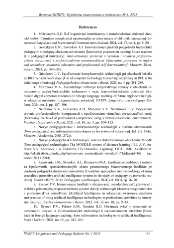 8. Реморенко, И.М. Кандидатные подходы и методика использования специализированных систем генеративного искусственного интеллекта при изучении педагогики студентами университета / И.М. Реморенко, А.И. Савенков, М.А. Романова // Вестник МГПУ. Сер. Педагогика и психология. - 2024. - Т. 18(3). - С. 76-90. EDN: CZABNM