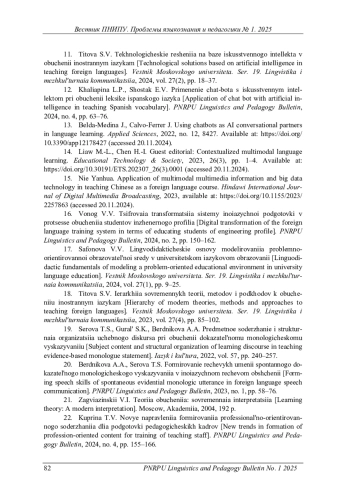 11. Титова, С.В. Технологические решения на базе искусственного интеллекта в обучении иностранным языкам / С.В. Титова // Вестник Моск. ун-та. Сер. 19. Лингвистика и межкультурная коммуникация. - 2024. - Т. 27(2). - С. 18-37. EDN: OWSQVG