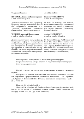 Дано описание технологии гибкого профессионально ориентированного переводческого чтения. В качестве исходных понятий принимаются «смысловое решение», «речевой поступок», «речедеятельностная единица письменного технического перевода» и др. Важной методологической основной выступает теория В. Д. Шадрикова о сложной структуре целеполагания. Обоснована необходимость включения во все упражнения и коммуникативно-речевые задачи целого, связного, осмысленного текста и его единиц. Сформулированы условия овладения знаниями, операциями и речевыми навыками. Для раскрытия специфики переводческого осмысления и понимания авторами раскрывается содержание ряда принципиальных вопросов о видах смысловых связей, роли информативного чтения как общения-диалога, последовательности осуществления речевых операций, речевых действий и речевой деятельности чтения во взаимосвязи с речевой деятельностью репродуктивного и продуктивного, творческого письма. В качестве ведущего типа структуры программы смыслового содержания при этом предлагается денотатная структура. Подробно изложена последовательность шагов, составляющих технологию обучения профессиональному переводческому чтению, которые предполагают выявление, осмысление, понимание всех мыслей каждого фрагмента, в своей совокупности образующих программу его смыслового содержания. В ходе исследования получила подтверждение гипотеза о том, что представленный способ выявления и фиксации лексем, объединенных по смыслу в денотатах, является наиболее эффективным способом на начальном этапе по сравнению со способом выявления, осмысления и формирования тема-рематических единств. Эффективность предложенной технологии обучения выявлению и пониманию всех смысловых связей в речевых фрагментах обусловлена строгой последовательностью и интеграцией разнохарактерных операций: речевых лексических операций в процессе действий информативного чтения и письма-фиксации, речемыслительных операций выявления сочетаемостно-синтагматических отношений между словами, речемыслительных операций думания и выделения слов в группу «тема» и «рема», лексико-морфологических операций и др.