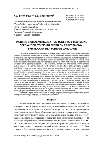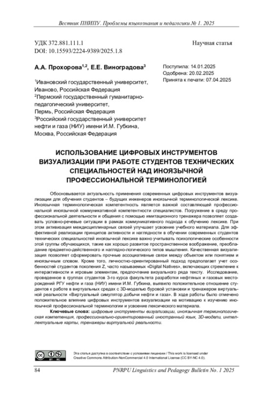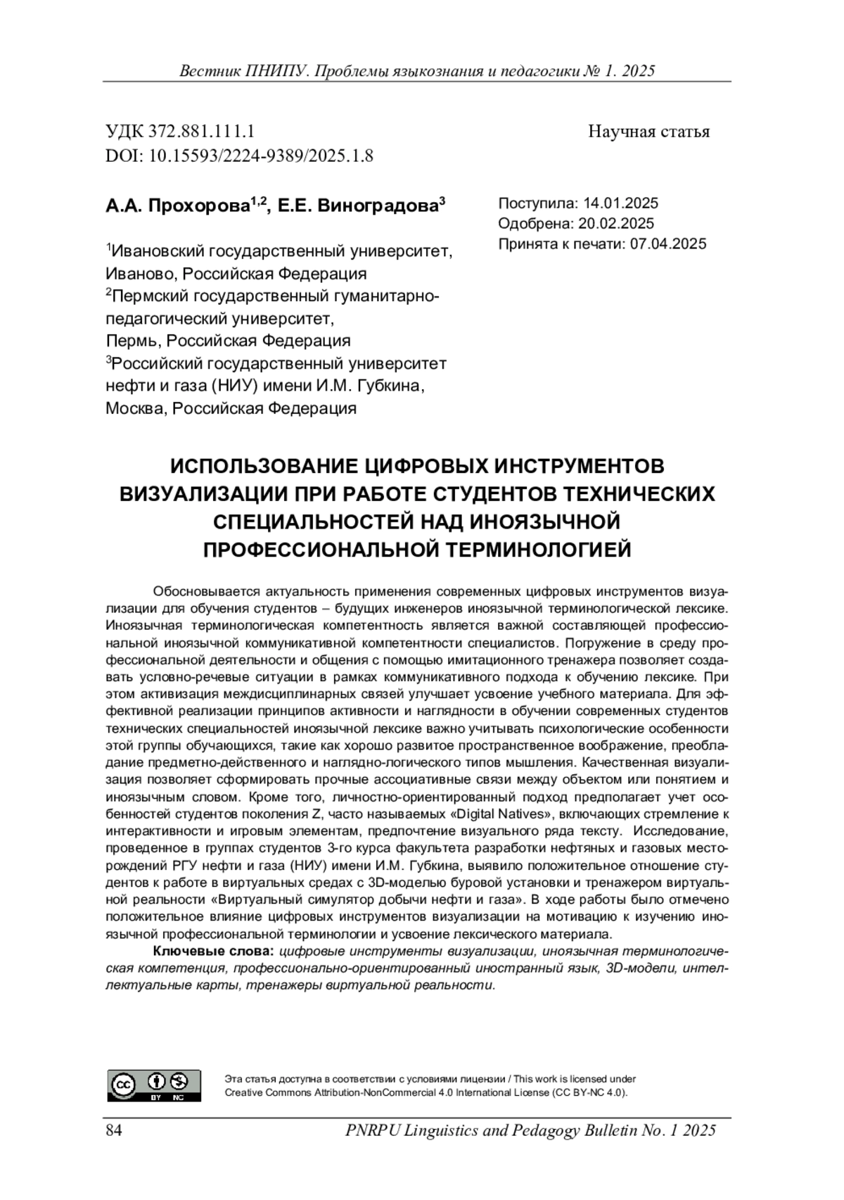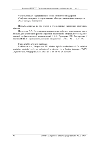 ПРОХОРОВА А. А., ВИНОГРАДОВА Е. Е. ИСПОЛЬЗОВАНИЕ ЦИФРОВЫХ ИНСТРУМЕНТОВ ВИЗУАЛИЗАЦИИ ПРИ РАБОТЕ СТУДЕНТОВ ТЕХНИЧЕСКИХ СПЕЦИАЛЬНОСТЕЙ НАД ИНОЯЗЫЧНОЙ ПРОФЕССИОНАЛЬНОЙ ТЕРМИНОЛОГИЕЙ // ВЕСТНИК ПЕРМСКОГО НАЦИОНАЛЬНОГО ИССЛЕДОВАТЕЛЬСКОГО ПОЛИТЕХНИЧЕСКОГО УНИВЕРСИТЕТА. ПРОБЛЕМЫ ЯЗЫКОЗНАНИЯ И ПЕДАГОГИКИ. 2025. № 1