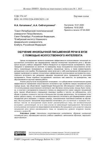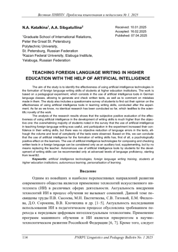 Целью исследования является выявление эффективности использования технологий искусственного интеллекта при формировании навыков иноязычной письменной речи у обучающихся высших учебных заведений. Работа базируется на педагогическом эксперименте, заключающемся в применении на занятиях по немецкому языку инструментов искусственного интеллекта, позволяющих генерировать и проверять письменные тексты, а также комментировать допущенные в них ошибки. Исследование также включает в себя анкетирование обучающихся на предмет выявления их мнения относительно эффективности использования инструментов искусственного интеллекта при овладении навыками письменной речи, проведенное по окончании эксперимента. Ранее подобных исследований, насколько нам известно, не проводилось, чем обусловливается научная новизна работы.