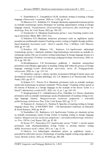 14. Ходжаниязова, У. К. современные подходы в обучении иноязычной письменной речи / У. К. Ходжаниязова // Вестн. Моск. ун-та. Сер. 20. Педагогическое образование. - 2020. - №1. - С. 110-116. EDN: WSRNNK