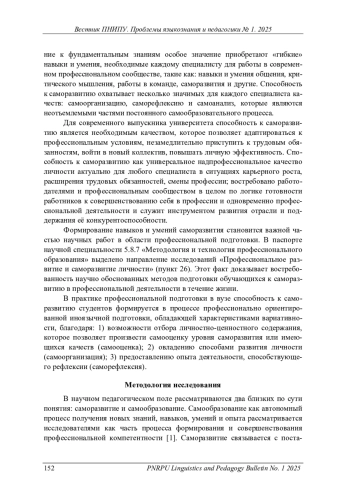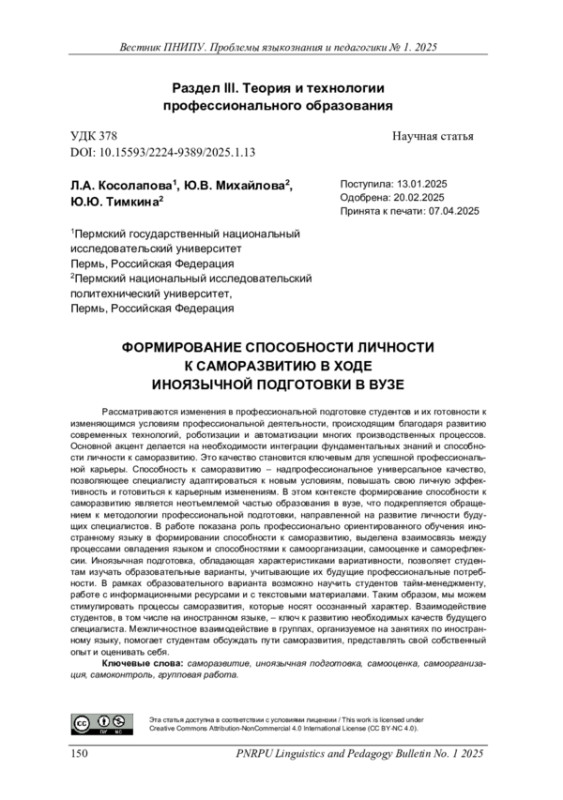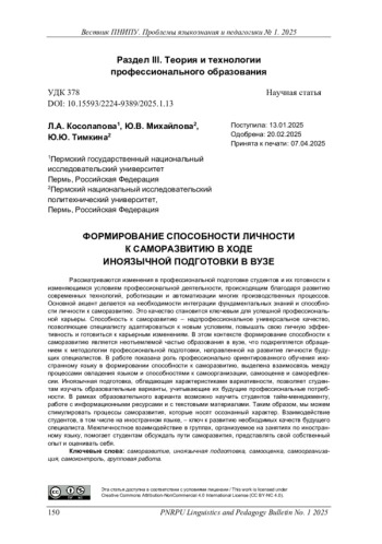 Рассматриваются изменения в профессиональной подготовке студентов и их готовности к изменяющимся условиям профессиональной деятельности, происходящим благодаря развитию современных технологий, роботизации и автоматизации многих производственных процессов. Основной акцент делается на необходимости интеграции фундаментальных знаний и способности личности к саморазвитию. Это качество становится ключевым для успешной профессиональной карьеры. Способность к саморазвитию – надпрофессиональное универсальное качество, позволяющее специалисту адаптироваться к новым условиям, повышать свою личную эффективность и готовиться к карьерным изменениям. В этом контексте формирование способности к саморазвитию является неотъемлемой частью образования в вузе, что подкрепляется обращением к методологии профессиональной подготовки, направленной на развитие личности будущих специалистов. В работе показана роль профессионально ориентированного обучения иностранному языку в формировании способности к саморазвитию, выделена взаимосвязь между процессами овладения языком и способностями к самоорганизации, самооценке и саморефлексии. Иноязычная подготовка, обладающая характеристиками вариативности, позволяет студентам изучать образовательные варианты, учитывающие их будущие профессиональные потребности. В рамках образовательного варианта возможно научить студентов тайм-менеджменту, работе с информационными ресурсами и с текстовыми материалами. Таким образом, мы можем стимулировать процессы саморазвития, которые носят осознанный характер. Взаимодействие студентов, в том числе на иностранном языке, – ключ к развитию необходимых качеств будущего специалиста. Межличностное взаимодействие в группах, организуемое на занятиях по иностранному языку, помогает студентам обсуждать пути саморазвития, представлять свой собственный опыт и оценивать себя.