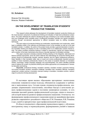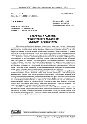 Статья: К ВОПРОСУ О РАЗВИТИИ ПРОДУКТИВНОГО МЫШЛЕНИЯ БУДУЩИХ ПЕРЕВОДЧИКОВ (2025)