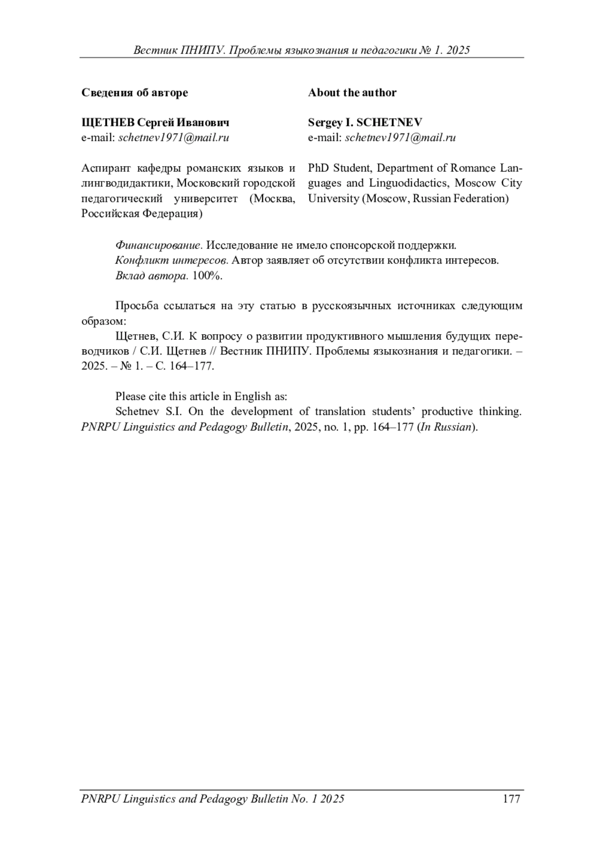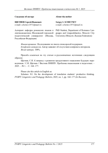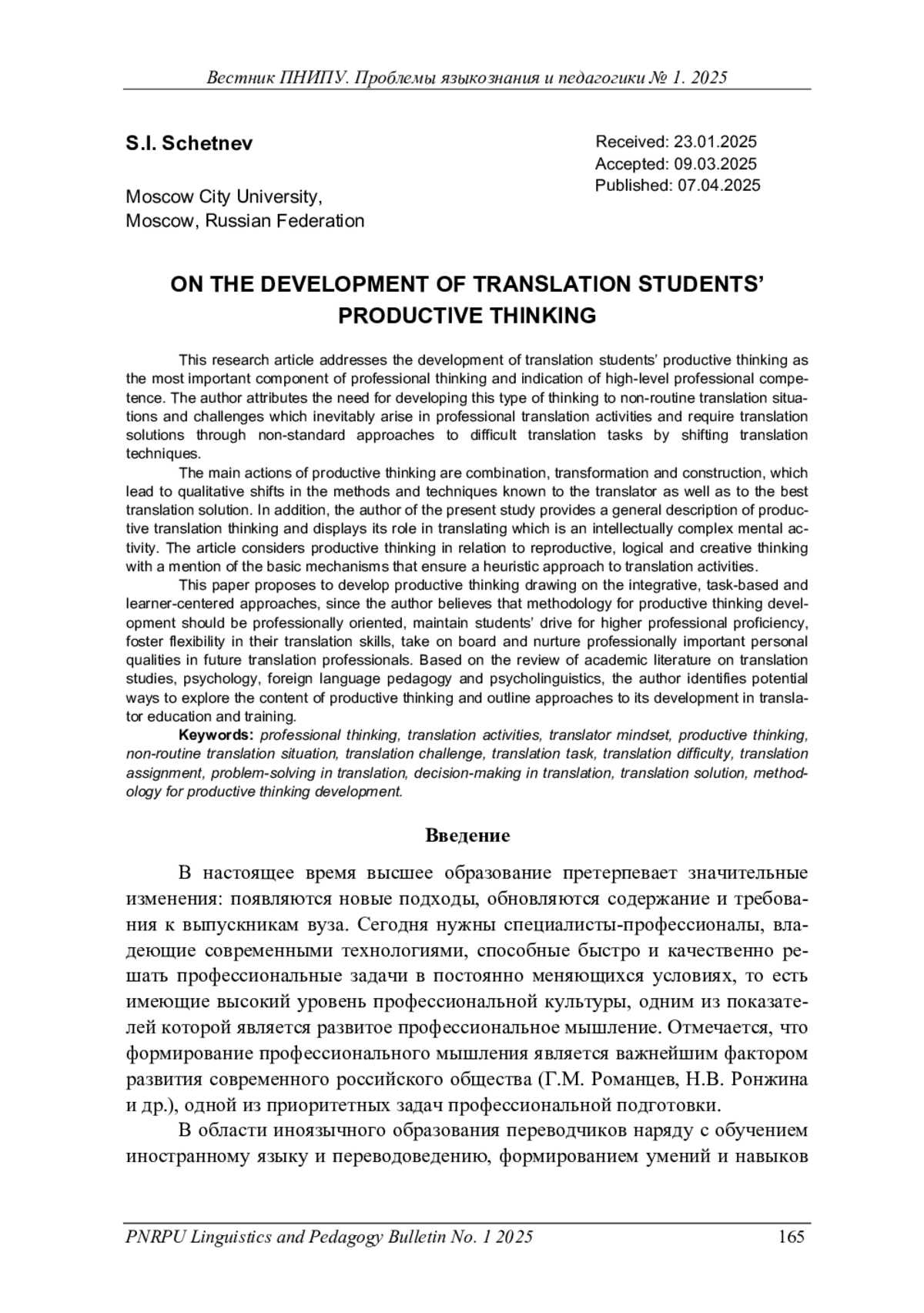 ЩЕТНЕВ С. И. К ВОПРОСУ О РАЗВИТИИ ПРОДУКТИВНОГО МЫШЛЕНИЯ БУДУЩИХ ПЕРЕВОДЧИКОВ // ВЕСТНИК ПЕРМСКОГО НАЦИОНАЛЬНОГО ИССЛЕДОВАТЕЛЬСКОГО ПОЛИТЕХНИЧЕСКОГО УНИВЕРСИТЕТА. ПРОБЛЕМЫ ЯЗЫКОЗНАНИЯ И ПЕДАГОГИКИ. 2025. № 1