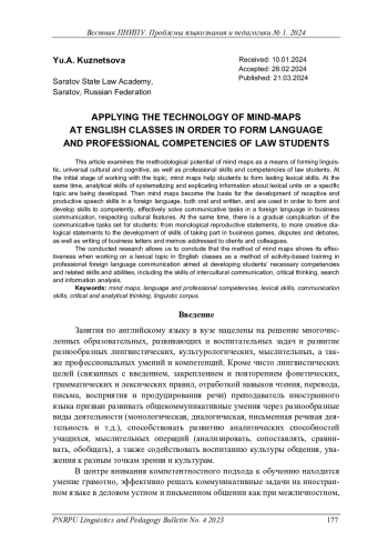 Рассматривается методический потенциал ментальных карт как средства формирования лингвистических, универсальных культурологических, мыслительных, а также профессиональных умений и компетенций у студентов-юристов. На начальном этапе работы с темой ментальные карты позволяют сформировать прочные лексические навыки у студентов. Одновременно происходит развитие аналитических навыков по систематизации и экспликации информации о лексических единицах по определенной теме. В дальнейшем ментальные карты становятся основой для развития рецептивных и продуктивных речевых умений на иностранном языке как в устной, так и в письменной форме. Они используются для формирования и развития умений грамотно, эффективно, культурно приемлемо решать коммуникативные задачи на иностранном языке в деловом общении. При этом происходит постепенное усложнение коммуникативных задач, которые ставятся перед студентами: от построения монологических репродуктивных высказываний к более творческим по своему характеру диалогическим высказываниям до развития умений, необходимых для ведения деловых игр, диспутов и дебатов, а также составления деловых писем и служебных документов, адресованных клиентам и коллегам. Проведенное исследование позволяет сделать выводы о том, что методика составления ментальных карт при работе над лексикой на занятиях по английскому языку показывает свою эффективность в качестве метода активного обучения профессиональной иноязычной коммуникации, направленного на развитие у обучающихся необходимых компетенций и связанных с ними навыков и умений, включающих умения межкультурного общения, критического мышления, поиска и анализа информации.