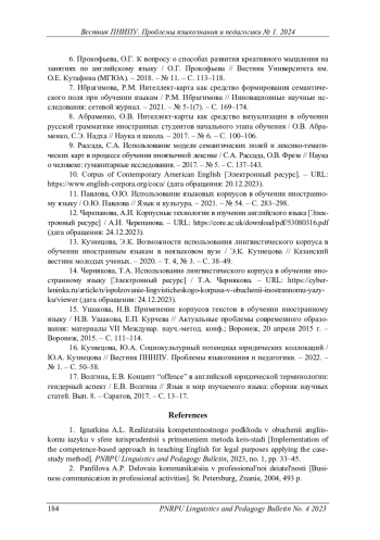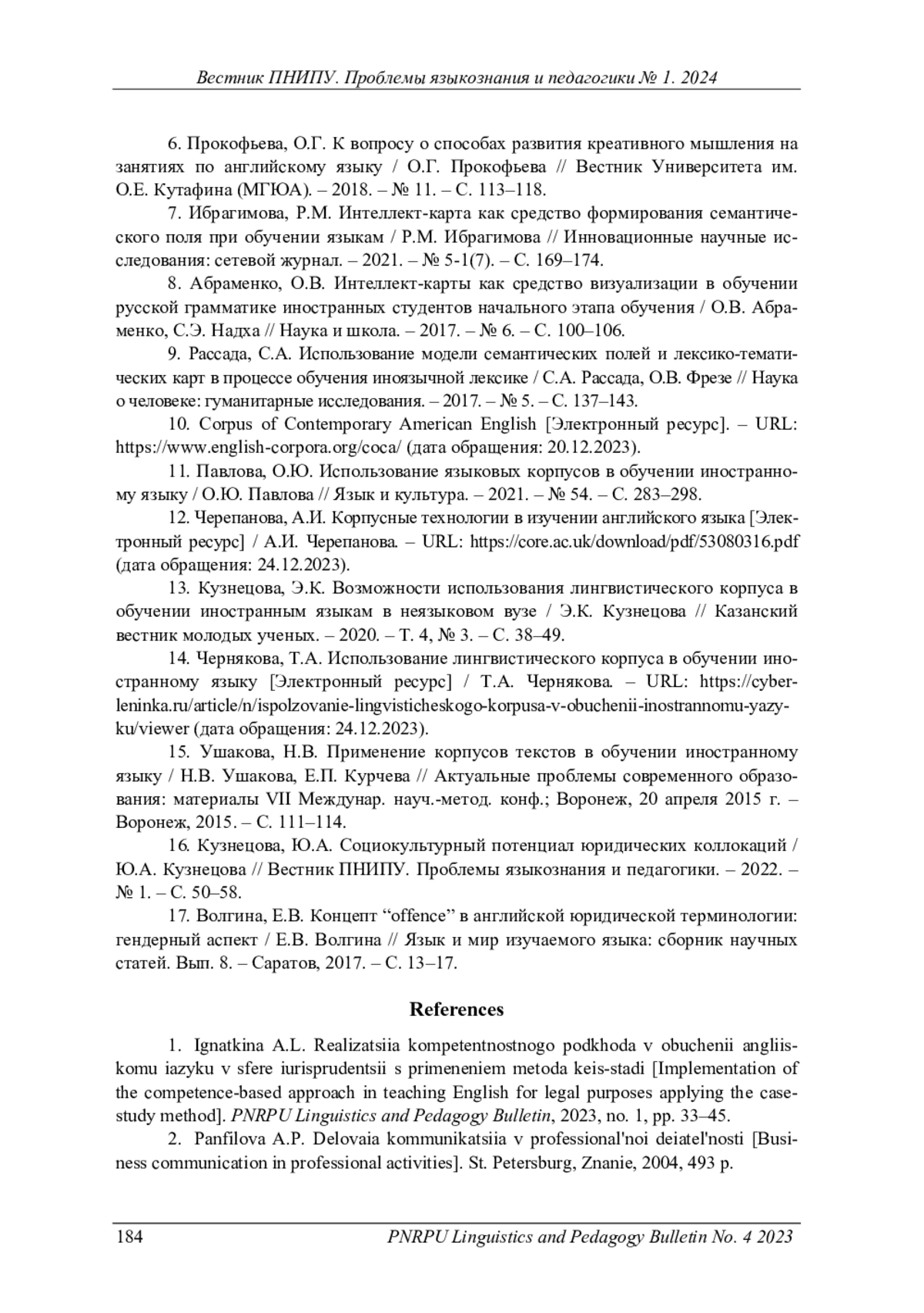 1. Игнаткина, А.Л. Реализация компетентностного подхода в обучении английскому языку в сфере юриспруденции с применением метода кейс-стади / А.Л. Игнаткина // Вестник ПНИПУ. Проблемы языкознания и педагогики. - 2023. - № 1. - С. 33-45. EDN: PINTTH
