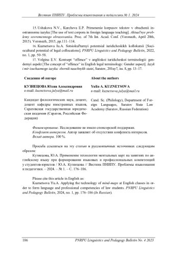 16. Кузнецова, Ю.А. Социокультурный потенциал юридических коллокаций / Ю.А. Кузнецова // Вестник ПНИПУ. Проблемы языкознания и педагогики. - 2022. - № 1. - С. 50-58. EDN: YPOKSF