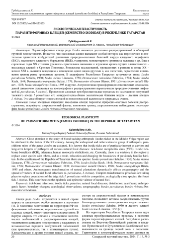 2. Губейдуллина А.Х. Видовое разнообразие и зоогеографическая характеристика паразитиформных клещей // Охрана окружающей среды и заповедное дело. 2024. Т. 5, № 1. С. 119-125. EDN: MHIDOL