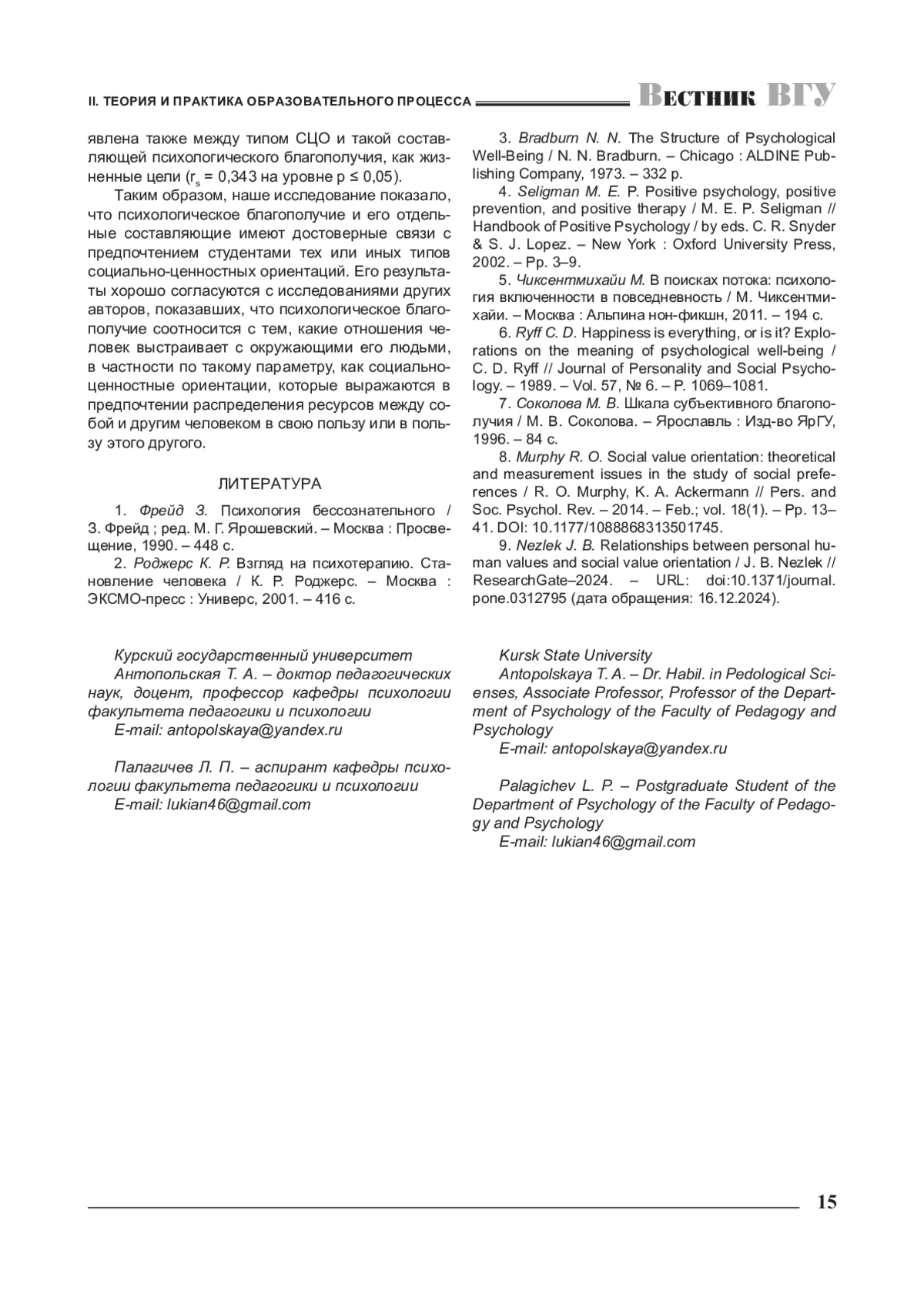 В условиях современных социально-культурных изменений важно понимать, как различные социально-ценностные ориентации (индивидуализм, коллективизм, альтруизм и конкуренция) влияют на субъективное восприятие психологического благополучия у студентов. Результаты исследования показали, что просоциальные ориентации положительно коррелируют с высоким уровнем психологического благополучия, тогда как ориентации на личный успех и материальное благосостояние связаны с низким уровнем.