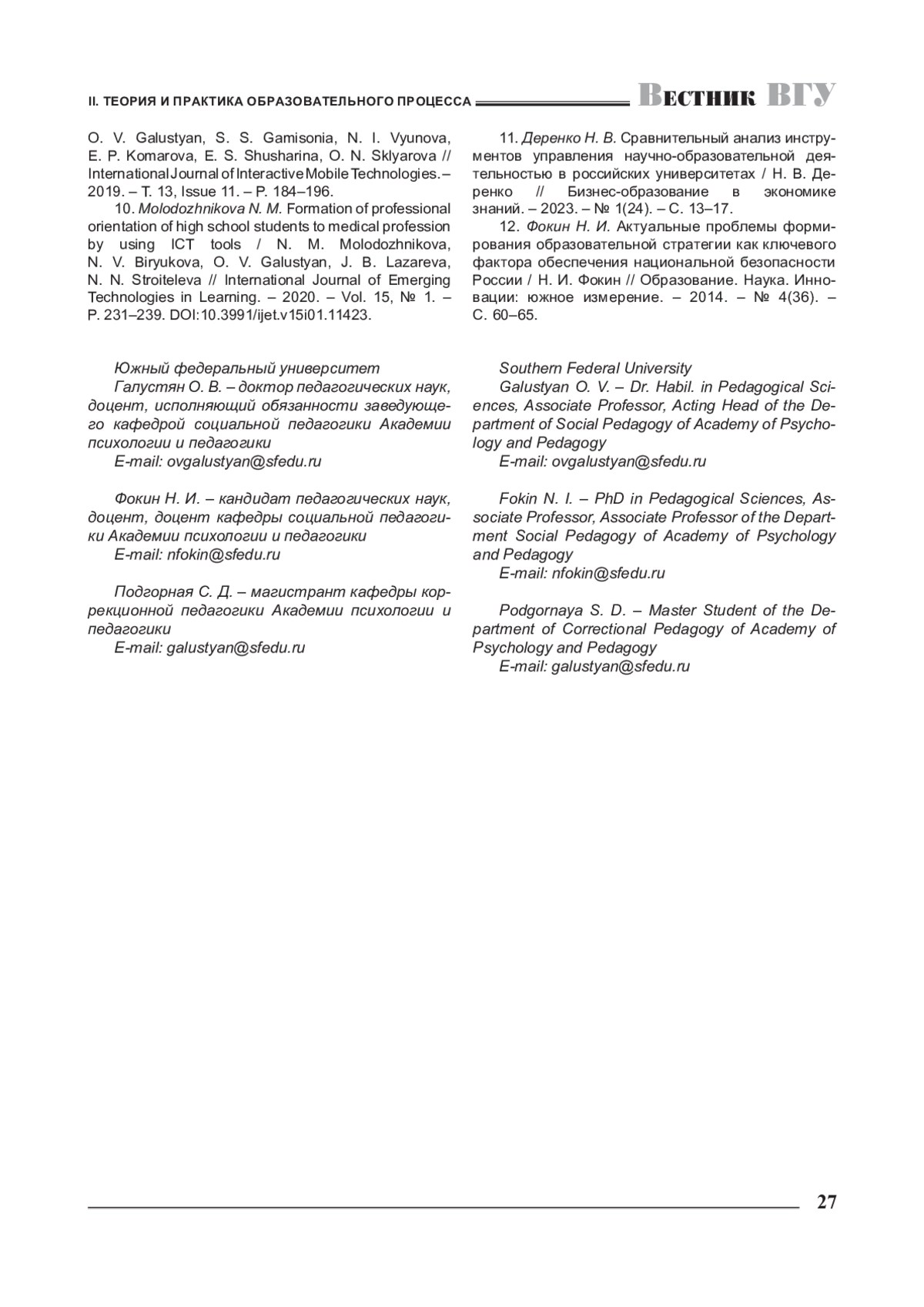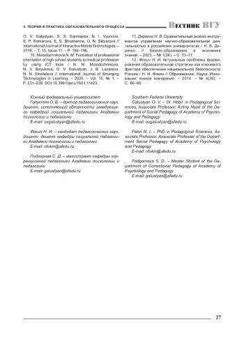 10. Molodozhnikova N. M. Formation ofprofessional orientation of high school students to medical profession by using ICT tools / N. M. Molodozhnikova, N. V. Biryukova, О. V. Galustyan, J. B. Lazareva, N. N. Stroiteleva // International Journal of Emerging Technologies in Learning. - 2020. - Vol. 15, № 1. -P. 231-239. DOI: 10.3991/ijet.v15i01.11423 EDN: OAZMNV
