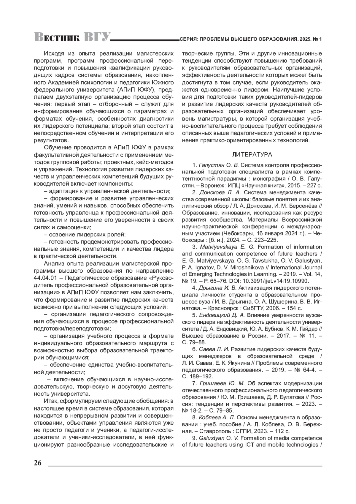 6. Савва Л. И. Развитие лидерских качеств будущих менеджеров в образовательной среде / Л. И. Савва, Е. К. Якунина // Проблемы современного педагогического образования. - 2019. - № 64-4. - С.189-192. EDN: QMKTGW
