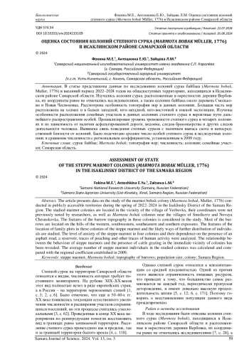 Статья: ОЦЕНКА СОСТОЯНИЯ КОЛОНИЙ СТЕПНОГО СУРКА (MARMOTA BOBAK MüLLER, 1776) В ИСАКЛИНСКОМ РАЙОНЕ САМАРСКОЙ ОБЛАСТИ (2024)