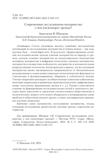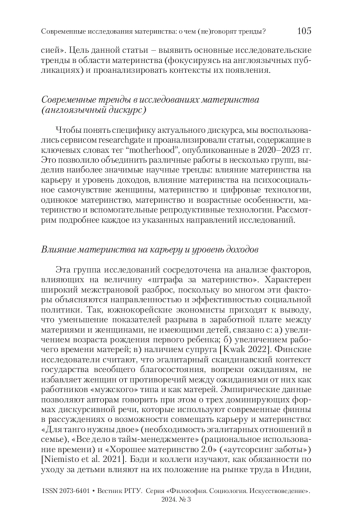 Статья посвящена анализу новейших англоязычных публикаций по исследованиям материнства (глубина поиска – три года, научная база – researchgate. net). В результате сформулированы основные исследовательские тренды: влияние материнства на карьеру и уровень доходов, влияние материнства на психосоциальное самочувствие женщины, материнство и цифровые технологии, одинокое материнство, материнство и возрастные особенности, материнство и вспомогательные репродуктивные технологии. Автор приходит к выводу, что исследования материнства имеют эволюционную направленность от биологического редукционизма к осмыслению социально-психологических факторов его становления и функционирования, обращены к субъектности матери. Ученые оперативно реагируют на общественные изменения и феномены, вносящие коррективы в привычные практики (пандемия, цифровизация, новые технологии, принимаемые законы и т. д.). Однако существенное влияние на формирование исследовательских полей и тональность дискурса имеет идеология и стремление соответствовать общественному и политическому запросу (что можно обнаружить в игнорировании одних проблем и избыточном анализе других, а также декларируемых принципах научных журналов). Ключевые слова