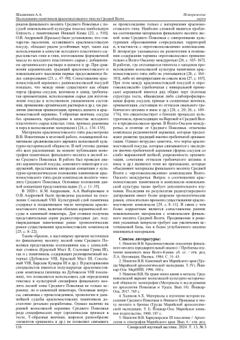 25. Андреев К.М., Выборнов А.А., Андреева О.В., Кулькова М.А. Поселение Сокольный VIII - новая стоянка позднего неолита Марийского Поволжья // Поволжская археология. 2023. № 3 (45). С. 8-24. DOI: 10.24852/pa2023.3.45.8.24 EDN: HRAVRS
