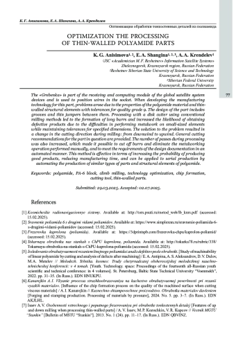 [5] Исследование обрабатываемости резанием линейного полиамида и анализ дефектов после обработки / Е. А. Антипина, А. С. Александров, Д. В. Дулов, М. А. Метелев // Молодежь. Техника. Космос: Труды четырнадцатой общероссийской молодежной научно-технической конференции: в 4 т., Санкт-Петербург, 23–27 мая 2022 года. Санкт-Петербург:
