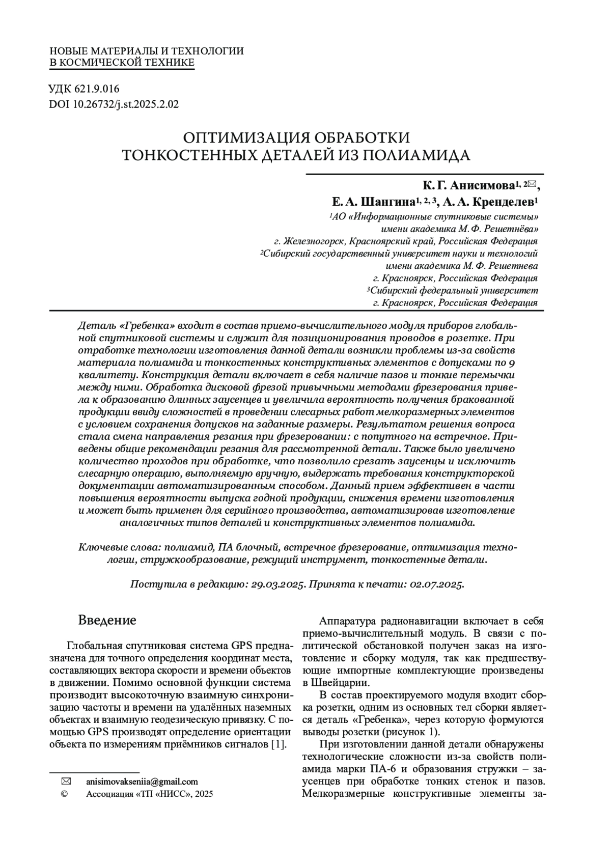 [7] Исаев А. В., Козочкин М. П., Купцов В. Р. Особенности встречного и попутного фрезерования при обработке тонкостенных деталей // Вестник МГТУ «Станкин». 2013. № 1(24). С. 11–17. EDN QBVINZ.