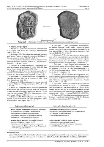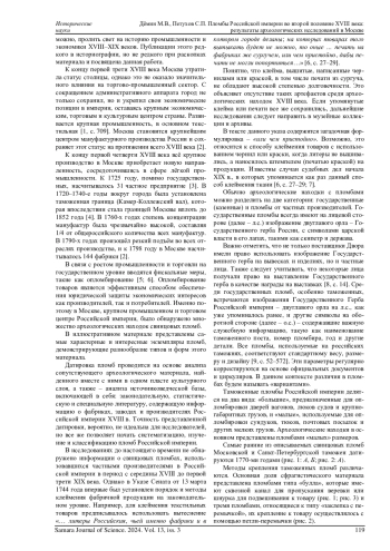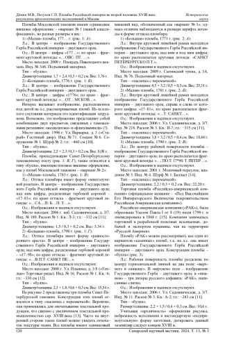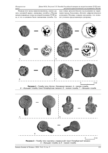 Статья посвящена краткому обзору сфрагистического материала Российской империи второй половины XVIII века, обнаруженного в ходе археологических раскопок в историческом центре г. Москвы по адресам: площадь Павелецкого вокзала; ул. Варварка, д. 3 («Старый» Гостиный двор); ул. Садовническая, д. 3/7; ул. Ильинка, д. 3/8 («Теплые» Торговые ряды); туп. Сытинский, д. 3 А; пер. Молочный, владение 3 в 1996-2009 гг. Пломбы Российской империи представляют собой значимые артефакты и являются ценным источником информации, свидетельствующим о развитии национальной промышленности, экономики, а также внешней и внутренней торговли. Сфрагистический материал представлен двумя видами пломб: «буллы» и «заклепки с перемычкой». «Буллы» представляют собой круглые или овальные пломбы, часто с изображением гербов или символов власти, что подчеркивает их официальный характер. Они могли использоваться как для упаковки товаров, что делало их важным элементом в системе торговли, так и для официальной документации. Заклепки с перемычкой, в свою очередь, служили для закрепления упаковки и защиты содержимого от несанкционированного доступа. Такие пломбы часто имели уникальные знаки или символы, что позволяло идентифицировать производителей или владельцев товаров. Исследование этих артефактов не только помогает понять экономические и торговые практики, фискальные процедуры того времени, но и освещает культурные и социальные аспекты жизни в Российской империи. Сфрагистический материал является важным элементом в реконструкции исторического контекста, а его анализ может дать новые знания о взаимодействии внешней и внутренней экономики и развитии государственной власти.