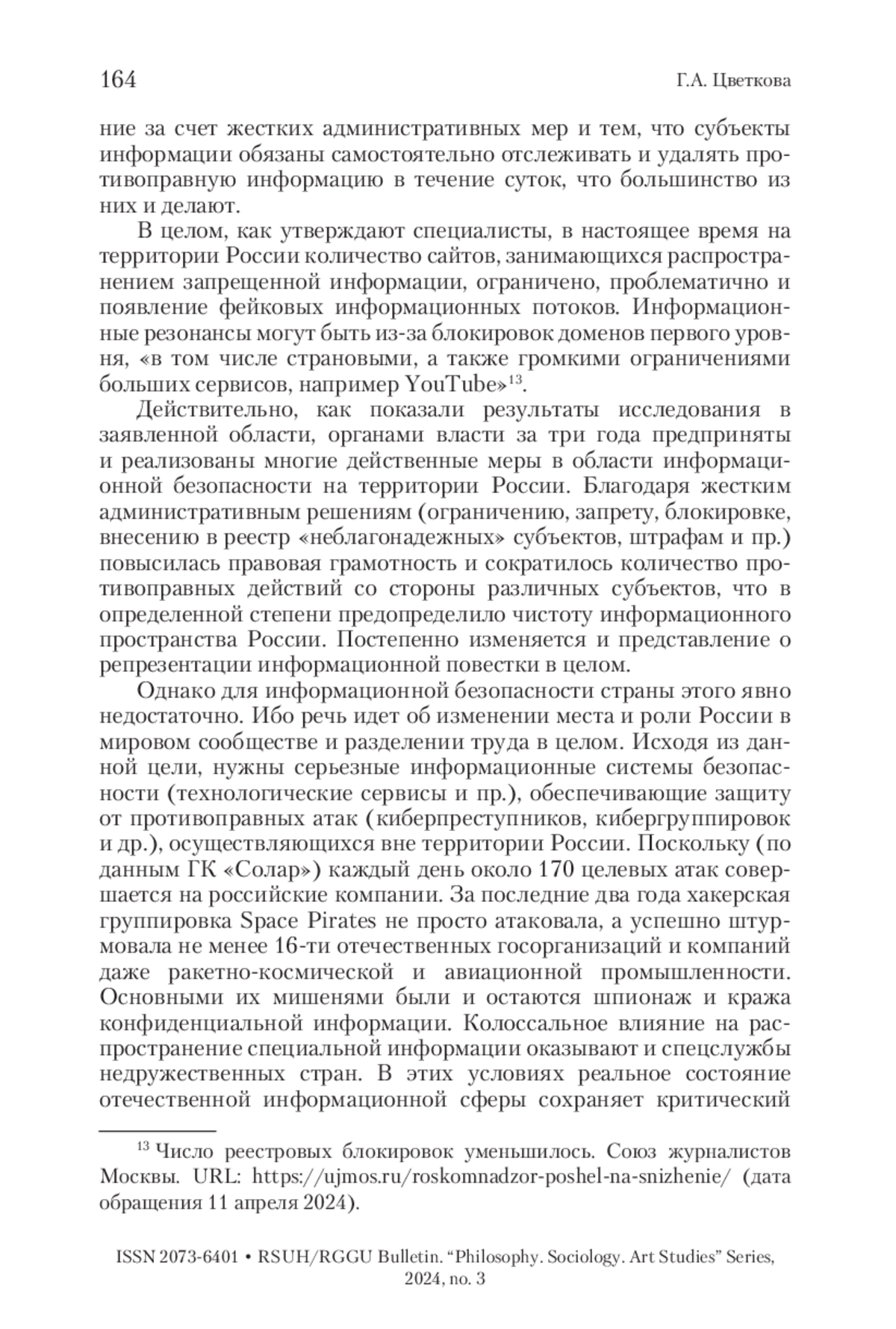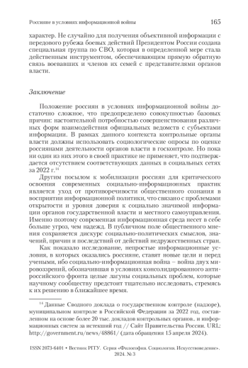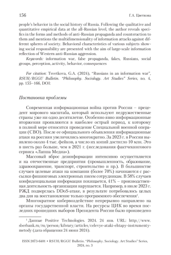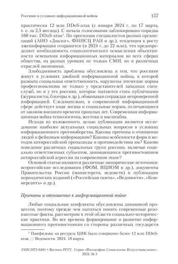 В статье информационная война (ИВ) рассматривается как одно из социально-информационных противоборств консолидированному антироссийскому фронту, имеющему глобальный характер. Востребованность интернета и информационных технологий предопределяет уникальность их влияния на общественное сознание и поведение людей в социальной истории России. На основе качественных и количественных эмпирических данных всероссийского уровня раскрываются особенности форм и методов антироссийской пропаганды и противодействия им, указывается многоаспектность информационных атак на разные сферы жизнедеятельности общества. Представлены особенности поведения различных субъектов, проявляющих социальную ответственность с целью широкомасштабного информационного отражения западной антироссийской агрессии.