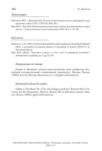 2. Ким 2023 - Ким М.Н. Инновационные практики в работе мультимедийных журналистов // Управленческое консультирование. 2023. № 4. С. 72-80.
