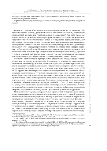 Одним из средств обеспечения национальной безопасности является сбережение народа России, достигаемое повышением качества и доступности медицинской помощи для укрепления здоровья граждан. При этом правовая охрана жизни и здоровья женщин при проведении искусственного прерывания беременности отвечает интересам семьи и государства, поскольку позволяет обеспечить сохранение репродуктивного потенциала населения и повышение демографических показателей. По данным Всемирной организации здравоохранения, в качестве ведущих причин смертности и заболеваемости матерей выступают небезопасные аборты. Ненадлежащее проведение данного медицинского вмешательства, особенно при наступлении неблагоприятного исхода, требует уголовно-правовой оценки, так как в таком случае причиняется вред жизни или здоровью пациентки либо создается угроза причинения такого вреда.