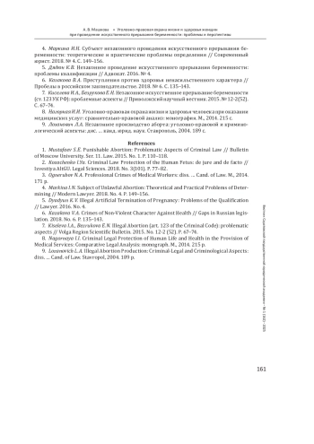 4. Маркина И. Н. Субъект незаконного проведения искусственного прерывания беременности: теоретические и практические проблемы определения // Современный юрист. 2018. № 4. С. 149-156. EDN: YUTMAH