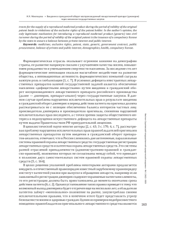 Выводы: законодательно установленная возможность заключения государственных контрактов на поставку воспроизведенного лекарственного препарата в период действия патента на оригинал приводит к нарушениям исключительных прав патентообладателя. По мнению автора, единственным законным механизмом введения в гражданский оборот воспроизведенный лекарственный препарат (дженерик) в период действия патента на оригинал является выдача государством принудительной лицензии для обеспечения баланса между частным интересом и интересами общества.