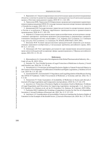 8. Латынцев А. В. Учет критериев доступности при ограничении исключительных прав патентообладателей на примере сферы здравоохранения // Журнал российского права. 2024. № 2. С. 55-65. EDN: CSKBWS