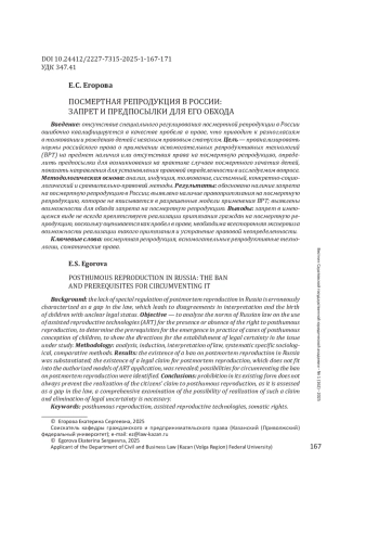 Результаты: обосновано наличие запрета на посмертную репродукцию в России; выявлено наличие правопритязания на посмертную репродукцию, которое не вписывается в разрешенные модели применения ВРТ; выявлены возможности для обхода запрета на посмертную репродукцию.