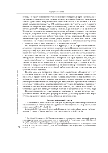 Введение: отсутствие специального регулирования посмертной репродукции в России ошибочно квалифицируется в качестве пробела в праве, что приводит к разногласиям в толковании и рождению детей с неясным правовым статусом. Цель - проанализировать нормы российского права о применении вспомогательных репродуктивных технологий (ВРТ) на предмет наличия или отсутствия права на посмертную репродукцию, определить предпосылки для возникновения на практике случаев посмертного зачатия детей, показать направления для установления правовой определенности в исследуемом вопросе.