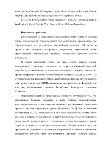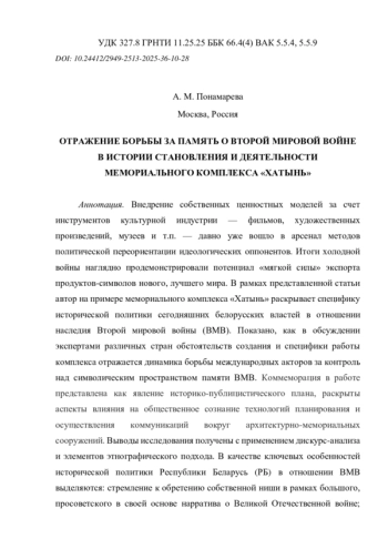 Внедрение собственных ценностных моделей за счет инструментов культурной индустрии — фильмов, художественных произведений, музеев и т. п. — давно уже вошло в арсенал методов политической переориентации идеологических оппонентов. Итоги холодной войны наглядно продемонстрировали потенциал «мягкой силы» экспорта продуктов-символов нового, лучшего мира. В рамках представленной статьи автор на примере мемориального комплекса «Хатынь» раскрывает специфику исторической политики сегодняшних белорусских властей в отношении наследия Второй мировой войны (ВМВ). Показано, как в обсуждении экспертами различных стран обстоятельств создания и специфики работы комплекса отражается динамика борьбы международных акторов за контроль над символическим пространством памяти ВМВ. Коммеморация в работе представлена как явление историко-публицистического плана, раскрыты аспекты влияния на общественное сознание технологий планирования и осуществления коммуникаций вокруг архитектурно-мемориальных сооружений. Выводы исследования получены с применением дискурс-анализа и элементов этнографического подхода. В качестве ключевых особенностей исторической политики Республики Беларусь (РБ) в отношении ВМВ выделяются: стремление к обретению собственной ниши в рамках большого, просоветского в своей основе нарратива о Великой Отечественной войне; акцент на роли Беларуси как «самой пострадавшей республике»; стремление к огосударствлению памяти о значимых событиях.