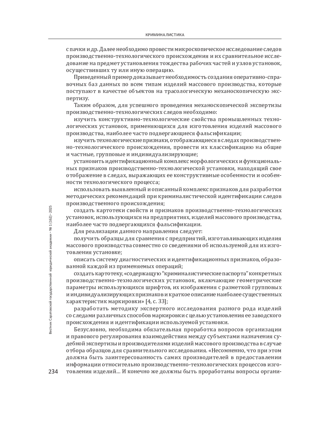 Выводы: полнота и всесторонность трасологических исследований при производстве механоскопической экспертизы следов производственно-технологического происхождения может быть достигнута при условии создания оперативно-справочных баз данных, содержащих конструктивные характеристики изделий, сведения о технологии их производства, нормативную терминологию, криминалистическую классификацию производственно-технологических признаков, отображающихся в данных следах, сведения о случаях фальсификации разного рода изделий и уже выявленных способах их подделки.