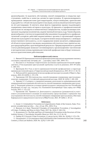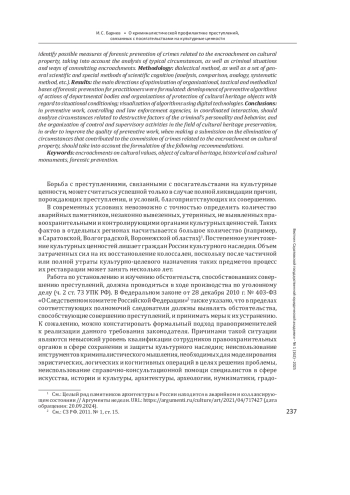 Выводы: в профилактической работе контролирующим и правоохранительным органам при согласованном взаимодействии необходимо анализировать обстоятельства, связанные с деструктивными факторами личности преступника и его поведением, с организацией контрольно-надзорной деятельности в сфере сохранения культурного наследия, в целях повышения качества профилактической работы при составлении представления об устранении обстоятельств, способствовавших совершению преступлений, связанных с посягательством на культурные ценности, следует учитывать сформулированные в статье критерии.