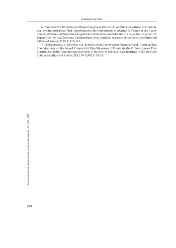 6. Чернова С.С. К вопросу о совершенствовании деятельности правоприменителей, направленной на устранение обстоятельств, способствовавших совершению преступления // Тенденции развития уголовно-процессуального законодательства Российской Федерации: сб. науч. тр. / под ред. О. А. Зелениной. Екатеринбург: Урал. юрид. ин-т МВД России, 2015. С. 115-121. EDN: VKOZOP