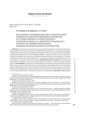 Введение: в современных условиях геополитической нестабильности обеспечение национальной безопасности становится ключевой задачей. Особую роль в этом процессе играет государственный контроль за оборотом гражданского оружия, осуществляемый войсками национальной гвардии Российской Федерации. Цель - изучить механизмы реализации полномочий Росгвардии по контролю за оборотом гражданского оружия, выявить их влияние на обеспечение безопасности государства, а также рассмотреть законодательные и организационные аспекты этой деятельности.