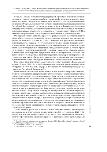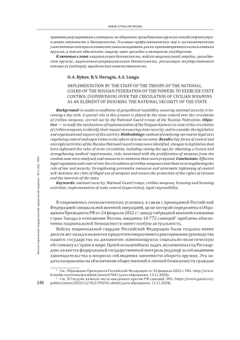 Результаты: определены ключевые формы контрольно-надзорной деятельности войск национальной гвардии РФ, выявлены изменения в законодательстве, ужесточившие правила оборота оружия, включая повышение возраста для получения лицензии и усиление медицинских требований, проанализированы риски, связанные с распространением оружия из зоны боевых действий, и предложены меры по их минимизации.
