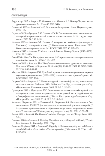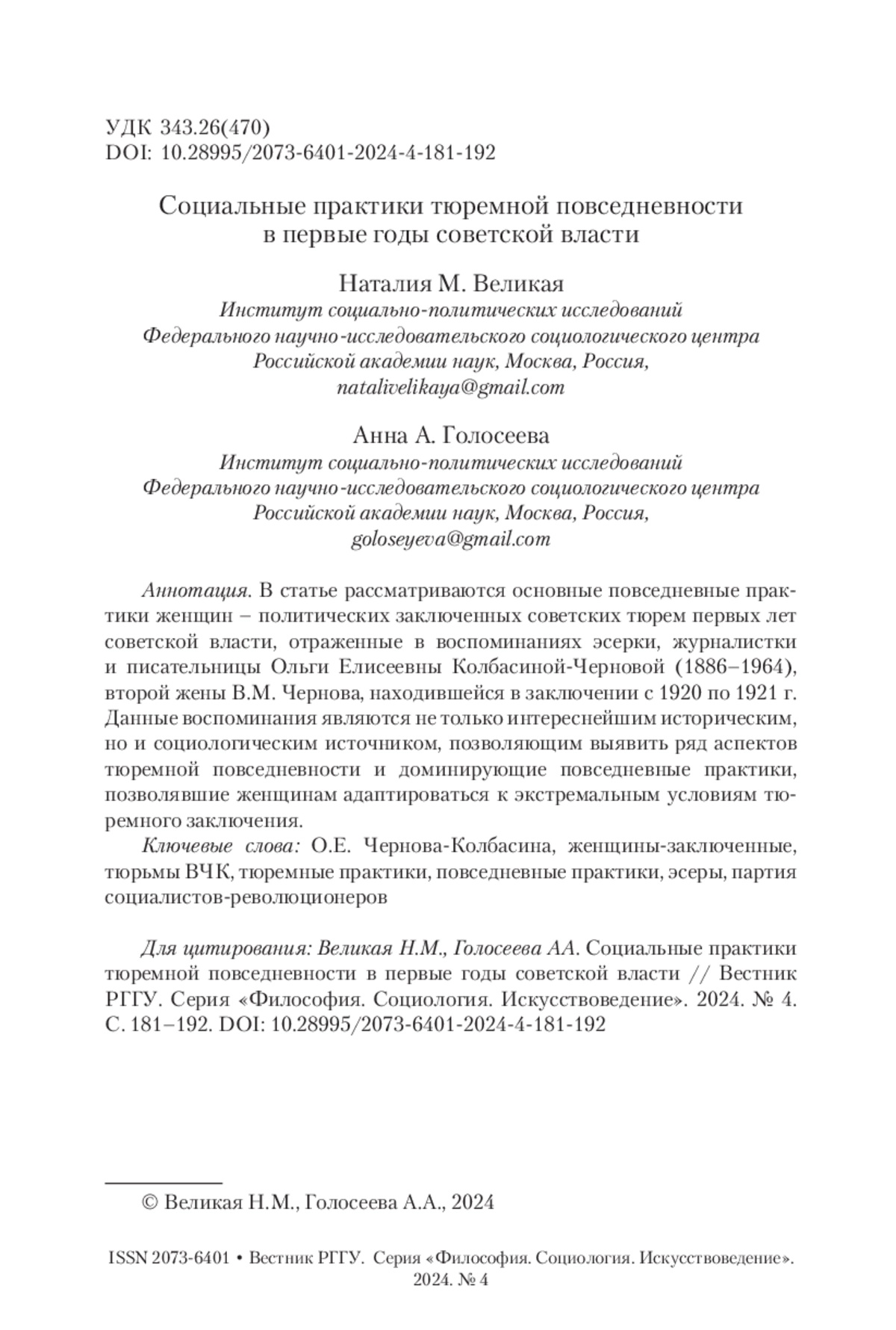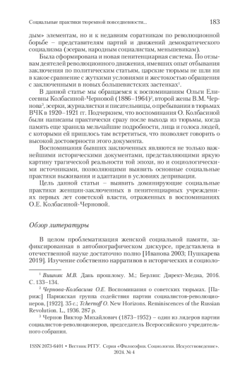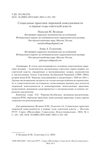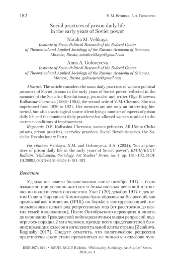 ВЕЛИКАЯ Н. М., ГОЛОСЕЕВА А. А. СОЦИАЛЬНЫЕ ПРАКТИКИ ТЮРЕМНОЙ ПОВСЕДНЕВНОСТИ В ПЕРВЫЕ ГОДЫ СОВЕТСКОЙ ВЛАСТИ // ВЕСТНИК РГГУ. СЕРИЯ: ФИЛОСОФИЯ. СОЦИОЛОГИЯ. ИСКУССТВОВЕДЕНИЕ. 2024. № 4
