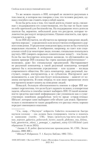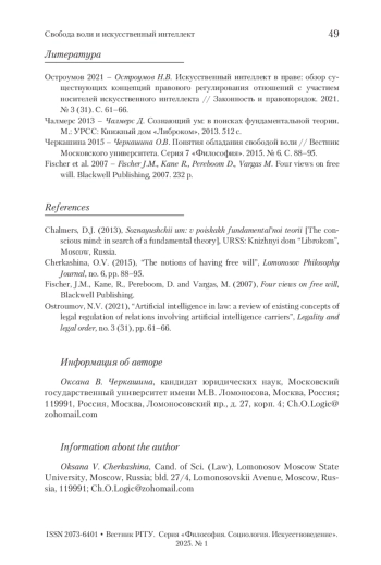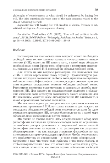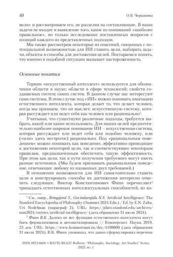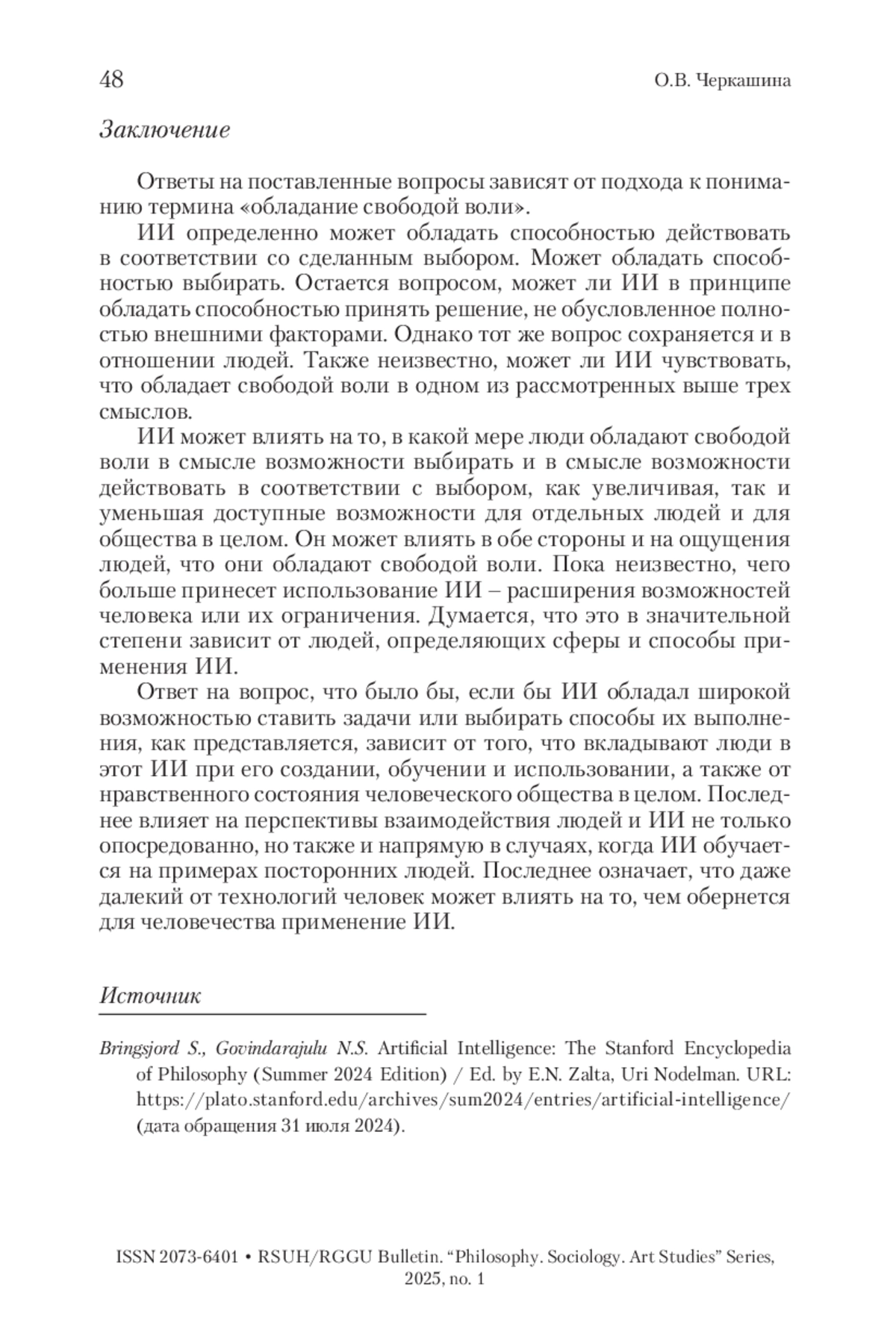 ЧЕРКАШИНА О. В. СВОБОДА ВОЛИ И ИСКУССТВЕННЫЙ ИНТЕЛЛЕКТ // ВЕСТНИК РГГУ. СЕРИЯ: ФИЛОСОФИЯ. СОЦИОЛОГИЯ. ИСКУССТВОВЕДЕНИЕ. 2025. № 1