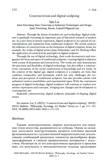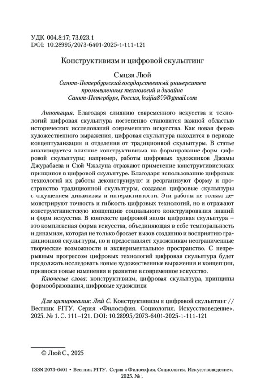 Благодаря слиянию современного искусства и технологий цифровая скульптура постепенно становится важной областью исторических исследований современного искусства. Как новая форма художественного выражения, цифровая скульптура находится в периоде концептуализации и отделения от традиционной скульптуры. В статье анализируется влияние конструктивизма на формирование форм цифровой скульптуры; например, работы цифровых художников Джамы Джурабаева и Сюй Чжэлуна отражают применение конструктивистских принципов в цифровой скульптуре. Благодаря использованию цифровых технологий их работы деконструируют и реорганизуют форму и пространство традиционной скульптуры, создавая цифровые скульптуры с ощущением динамизма и интерактивности. Эти работы не только демонстрируют точность и гибкость цифровых технологий, но и отражают конструктивистскую концепцию социального конструирования знаний и форм искусства. В контексте цифровой эпохи цифровая скульптура – это комплексная форма искусства, объединяющая в себе темпоральность и динамизм, которая не только бросает вызов созданию и восприятию традиционной скульптуры, но и предоставляет художникам неограниченные творческие возможности и экспериментальное пространство. С непрерывным прогрессом цифровых технологий цифровая скульптура будет продолжать исследовать новые художественные выражения и концепции, привнося новые изменения и развитие в современное искусство.