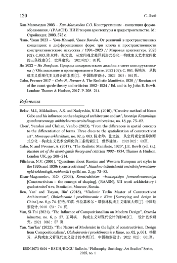 6. Чэнь, Чжан 2023 - Чэнь Юншуй, Чжан Вэньбо. От различий в пространственных концепциях к дифференциации форм: три ключа к пространственности конструктивистского искусства / 1994-2023 // Мировая архитектура. 2023 (02): C.083. 陈永帅,张文波. 从空间观念差异到形式分化-构成主义艺术空间化 的三条线索[C]. 世界建筑, 2023(02): 83页.