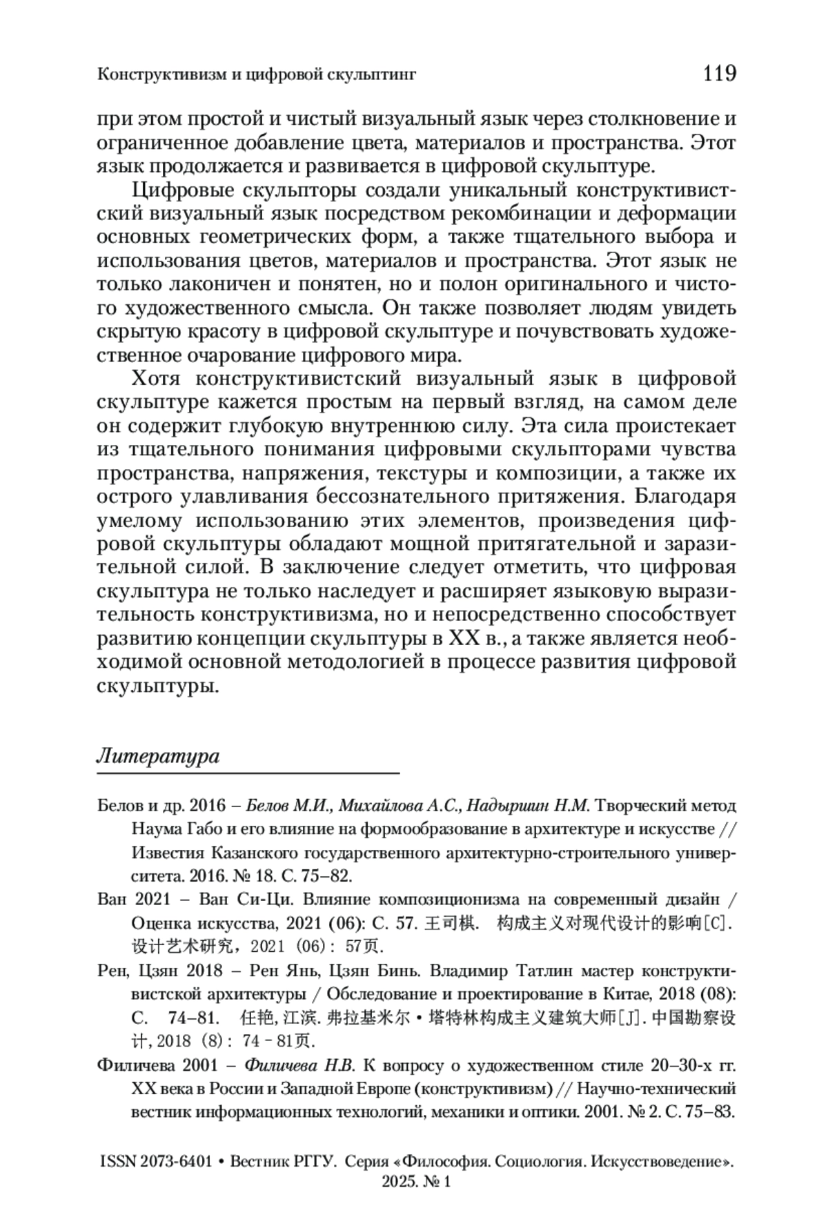 1. Белов и др. 2016 - Белов М.И., Михайлова А.С., Надыршин Н.М. Творческий метод Наума Габо и его влияние на формообразование в архитектуре и искусстве // Известия Казанского государственного архитектурно-строительного университета. 2016. № 18. С. 75-82.