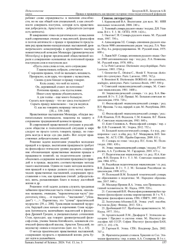 Актуальность темы статьи мотивируется потребностью осмысления проблемы воспитания учащейся молодежи правдой и в правде, решение которой зависит, в частности, от знания учителем содержания понятий «правда» и «правдивость». Авторы статьи осмысливают содержания понятий «правда» и «правдивость», обращаясь к описаниям соответствующих лексем в словарях русского и французского языка, к трактовке понятий, присутствующей в немногих специальных словарях, а также учитывая функционирование понятий в современных научных и классических этико-философских текстах. Показывается, что ученые-этики употребляют понятие «правда» в значениях принципа нравственности, ценности, порядка бытия и человеческих отношений; понятие «правдивость» - в значениях морального качества и качества души (добродетели), свойства человека, морального правила и ценности. Объясняется суть ценностного конфликта, заложенного в ситуации «лжи по необходимости» или «лжи во спасение». В результате осмысления идей мыслителей и философов Древней Греции о правде и правдивости выявляется, что Гесиод и Орфей употребляют слово «правда» как имя собственное - имя богини Дикэ (Правда) для обозначения правосудия и возмездия, порядка в природе и временах года; Гераклит - в значении справедливого возмездия, справедливости; Парменид - справедливости; Протагор - добродетели; Платон - блага; Аристотель - приговора и расплаты. Платон употребляет слово «правдивость» в значении способности совершать поступок; Аристотель - добродетели. Знание содержания понятий «правда» и «правдивость» важно для теории воспитания в части, относящейся к обоснованию культурологического содержания воспитания правдой и в правде, для практики воспитания - в части, относящейся не только к определению, но и к разработке методов воспитания правдой. Авторы настаивают, что одним из таких методов воспитания правдой и в правде должен стать метод практических нравственных наставлений, в частности, содержащихся в изречениях Семи мудрецов Античности, в увещевательных сочинениях Стои и других классических суждениях о правильной жизни.